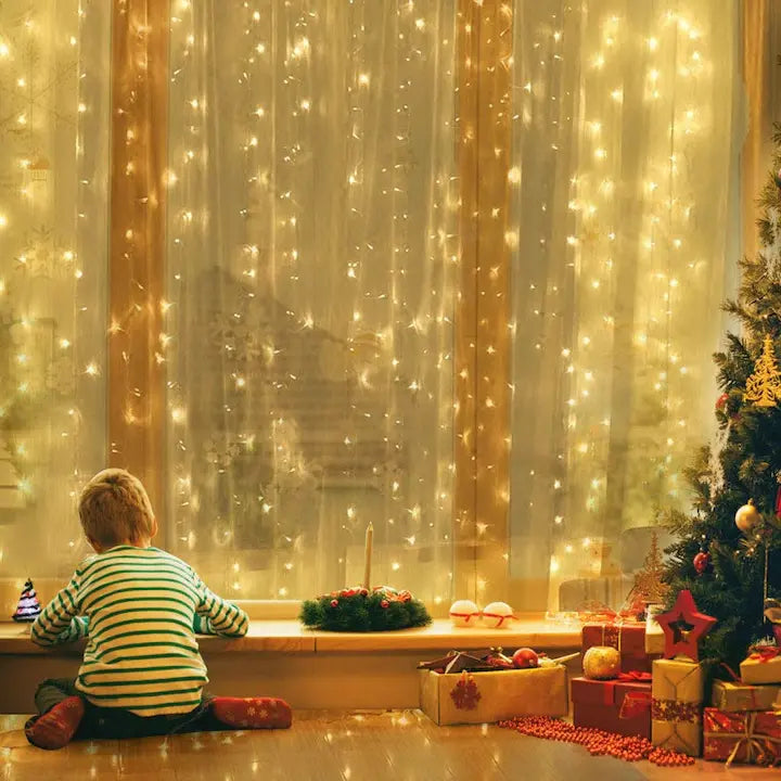 Perdea luminoasă de Crăciun, 3x3 m, cu 300 LED-uri și 8 moduri de iluminare, model interconectabil.
